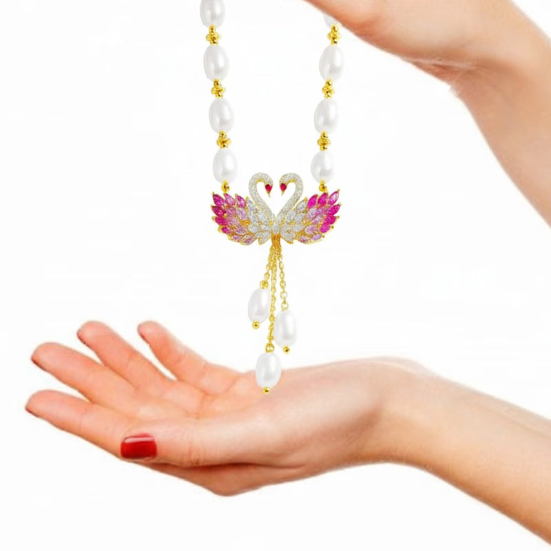 Dos cisnes formando un corazón, alas en destellos rosados y caída de perlas en cascada. Es la pieza “wow” que convierte cualquier look en algo memorable.