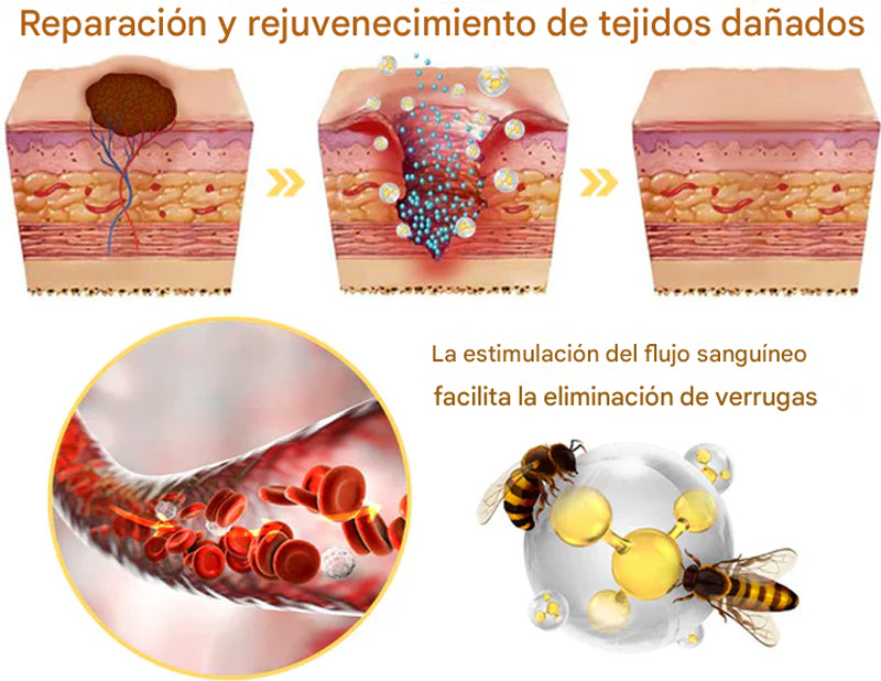 El veneno de abeja contiene múltiples elementos bioactivos como melitina, apamina y adolapina, cuya eficacia ha sido científicamente probada para combatir verrugas y acrocordones. Cabe destacar que, entre sus componentes enzimáticos, la fosfolipasa A2 destaca por su capacidad para degradar el tejido anormal, acelerando así la eliminación de verrugas y acrocordones.