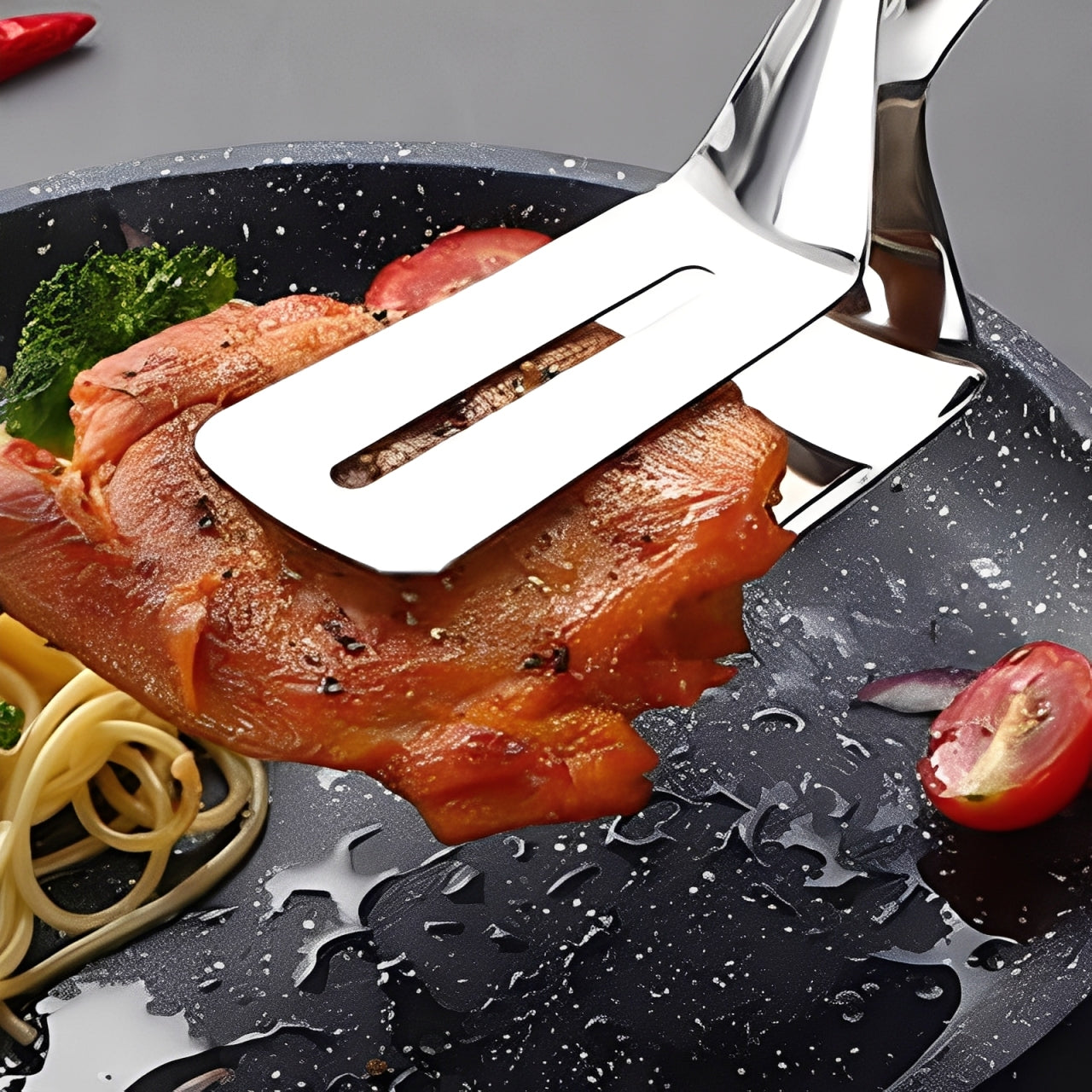 - ✅ Diseño todo en uno . No solo es una pala para freír, sino también una pinza. Corta, saca y prepara filetes en sándwiches, además de facilitar el volteo. Su diseño hueco especial facilita la salida del aceite y reduce el exceso. Las pinzas de cuello ancho son fáciles de agarrar, ya sea para verduras, un filete grande o pan.